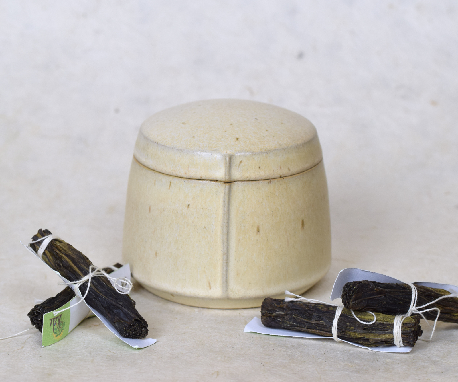 Een handgemaakt bewaardoosje van keramiek, gevuld met verfijnde groene thee- ‘sigaren’.